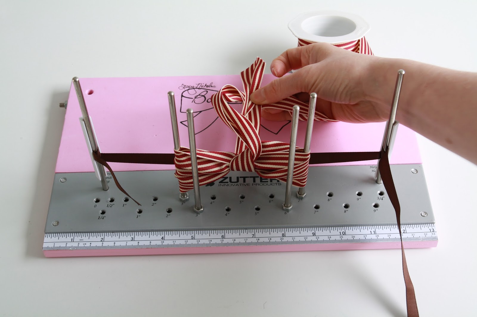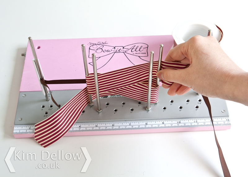 Set up the Bow-it-All to make a 4 inch wide double bow by placing the pegs in the 3 inch and 7 inch holes on the middle row and the 3 inch and 6 inch holes on the bottom row. I also wanted to add a piece of ribbon to tie the bow onto the wreath so used the outer ‘Helping Hands Peg’ holes.