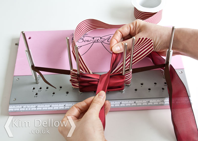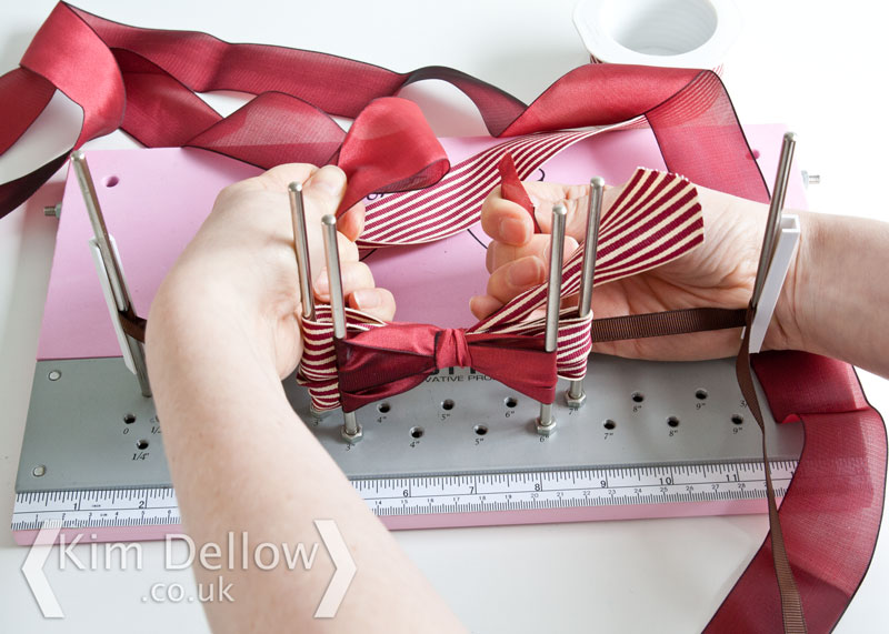 This time when you come to tie the infamous bow knot make sure that you wrap the tail / arrow-cut end around the first bow you made, sitting on the back pegs, and the placement ribbon that has been minding its own business between the helping hands pegs too.