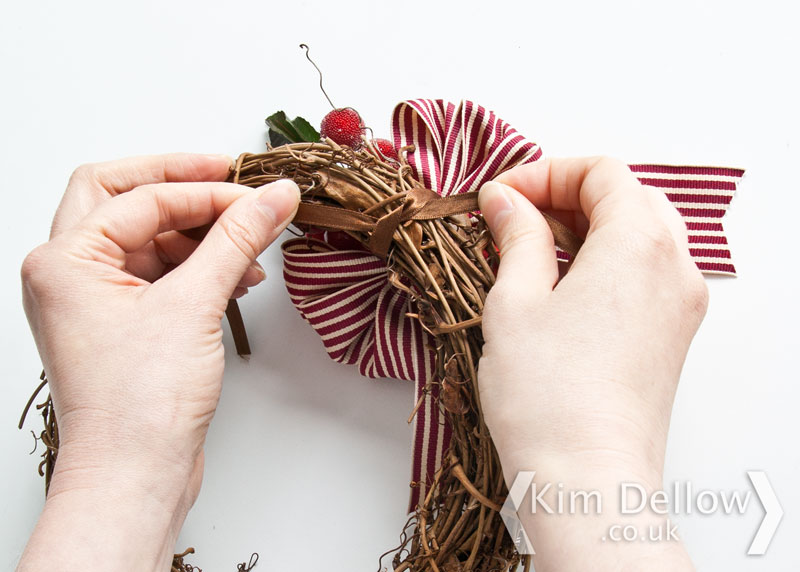 Now turn the wreath over and use the brown piece of ribbon on your bow to tie it to the wreath. How simple is that?