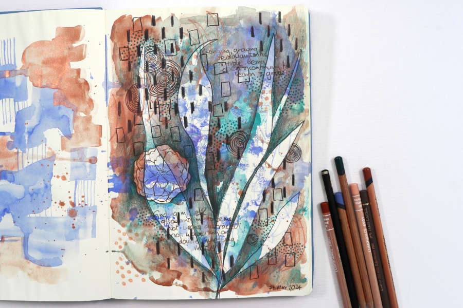 We are going to keep the playful vibe going in Journal Club too but this time with a focus on colour and finding your ways to play with colour. It is always a fascinating subject isn’t it?! And you can see how I picked the colours for this abstract leafy piece. As I grow it layer by layer, going from random colours to honing into a combination and getting it to work in a way that makes you happy in your work.