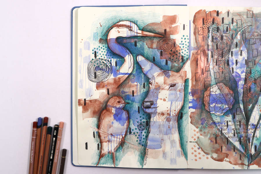 We have two different exercises for all of the Studio Clubbies tiers. The sister page to Journal club but this time focusing on animals from my recent trip to Japan. In this project we will be seeing how we can evolve our ideas as we work with colours and how we use them. But also with the way we grow and add interest to a piece.